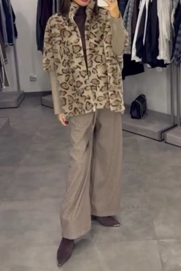 Women Casual Stand Collar Plush Leopard Print Paneled Knit Sleeve Zipper Jacket