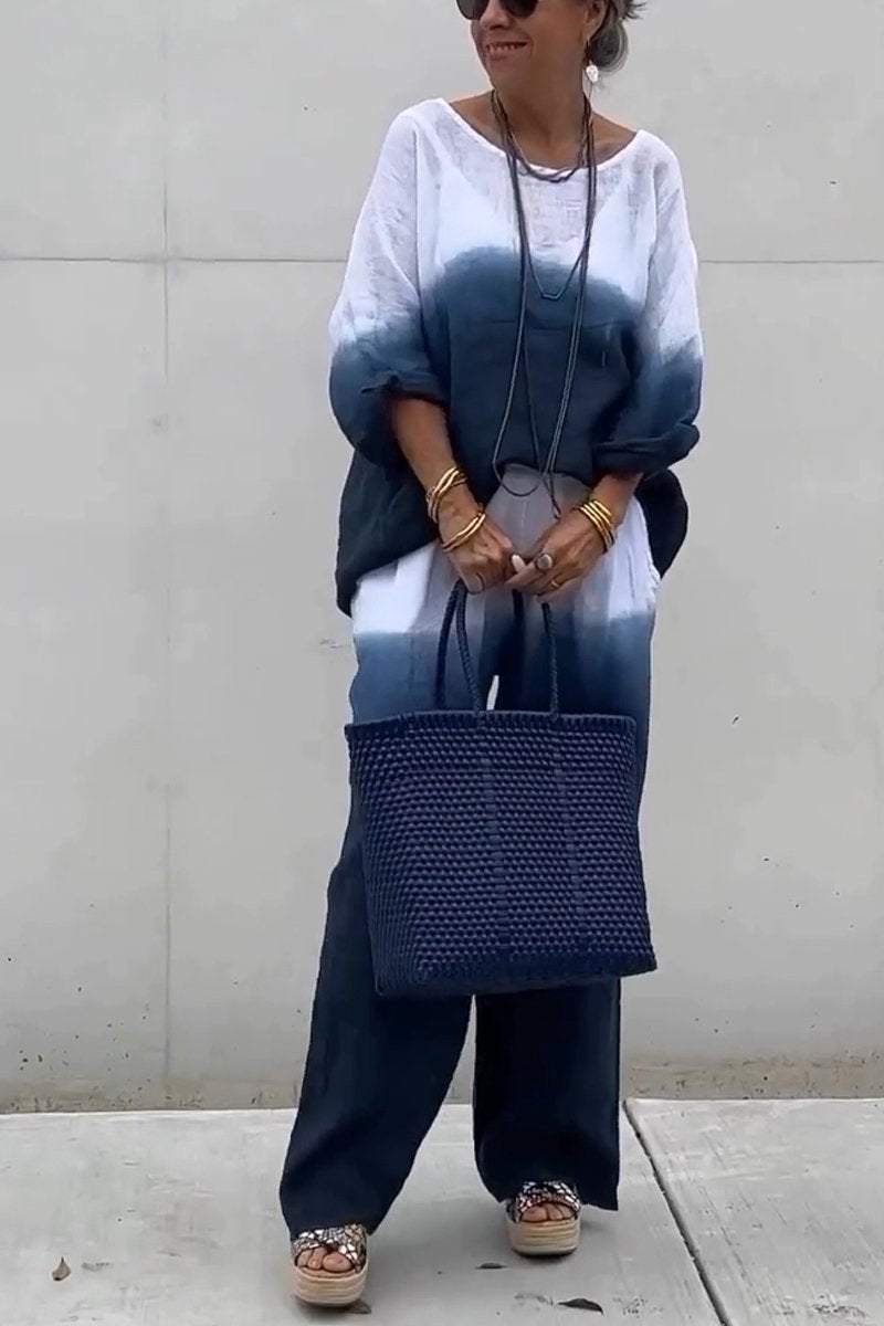 Women's Casual Round-neck Gradient Cotton and Linen Two-piece Suit