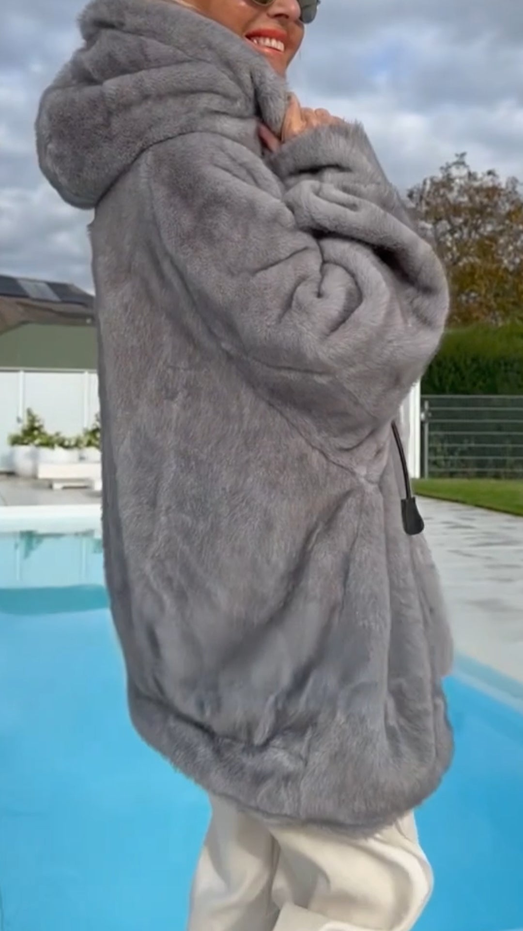 Women Hooded Drawstring Plaid Sleeve Zipper Design Casual Long Coat