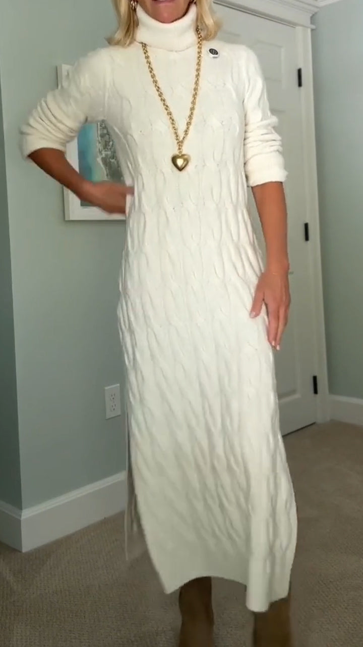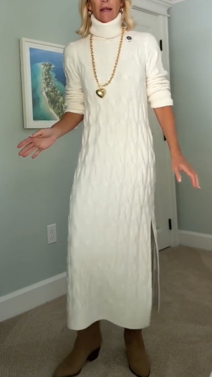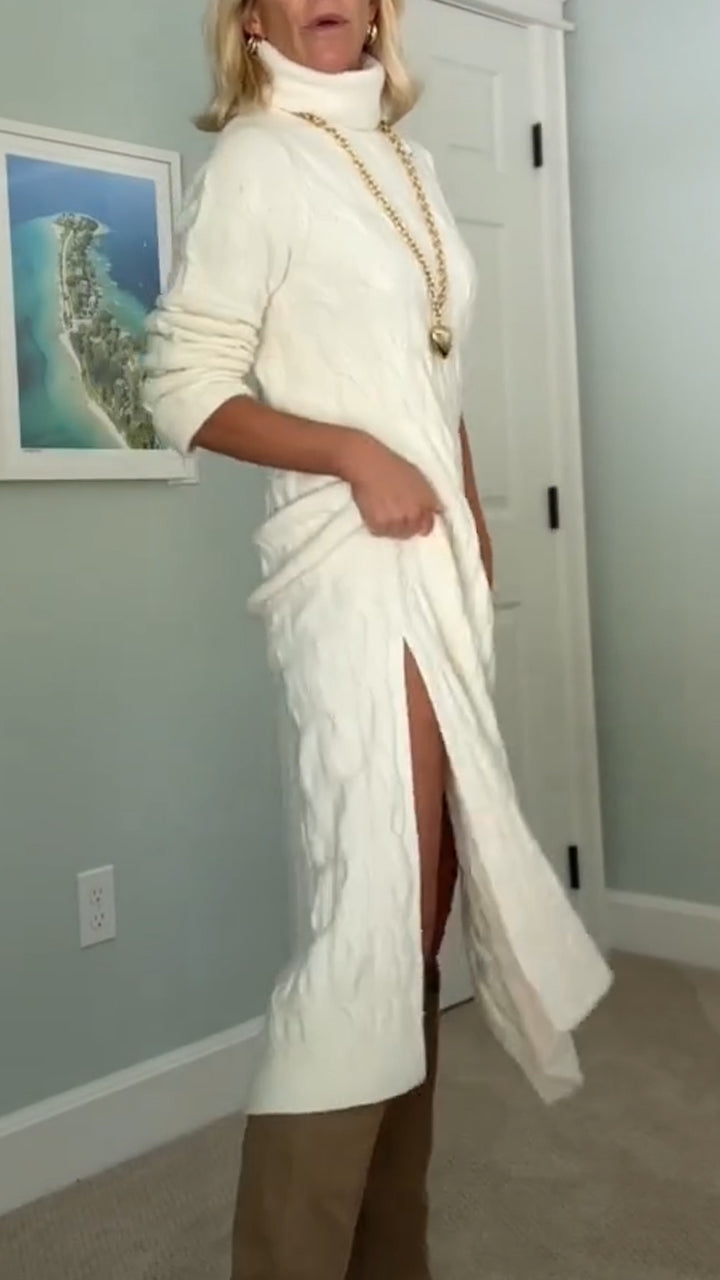 Women Turtleneck Cable Knit Side Slit Casual Sweater Dress