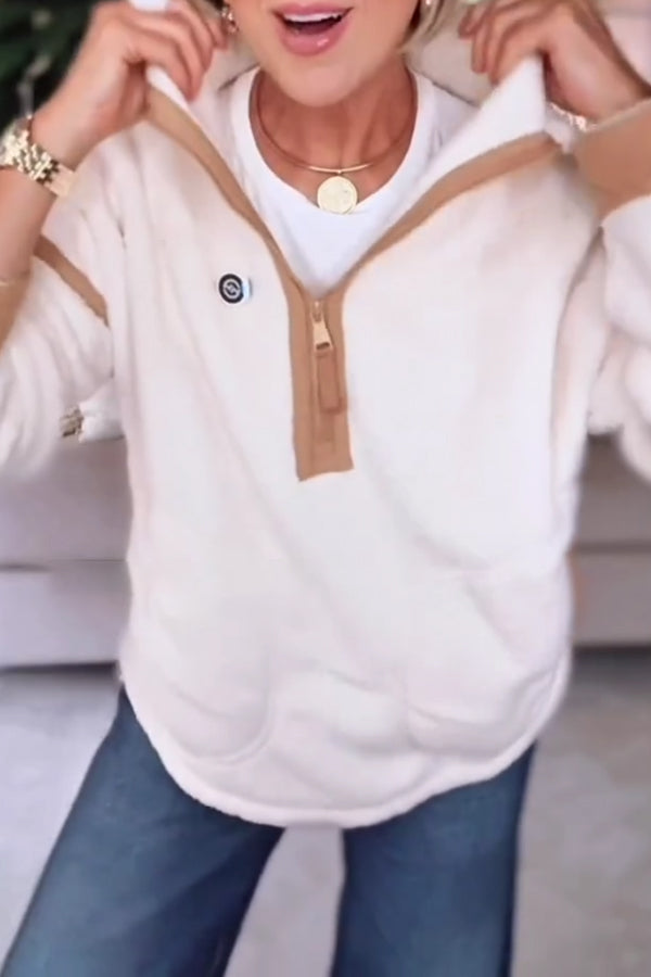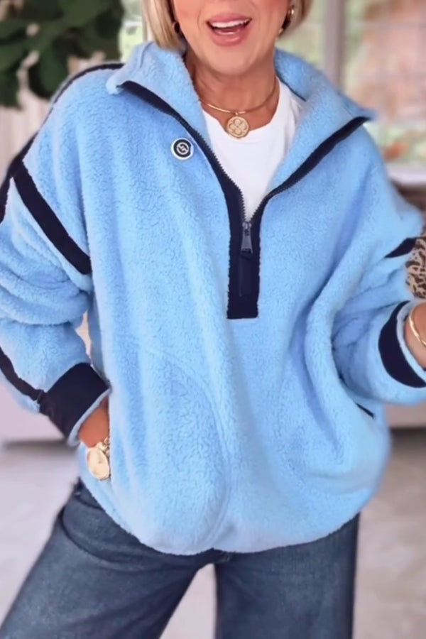 Women Casual Contrast Color Stitching Zipper Half-Placket Stand Collar Plush Sweatshirt