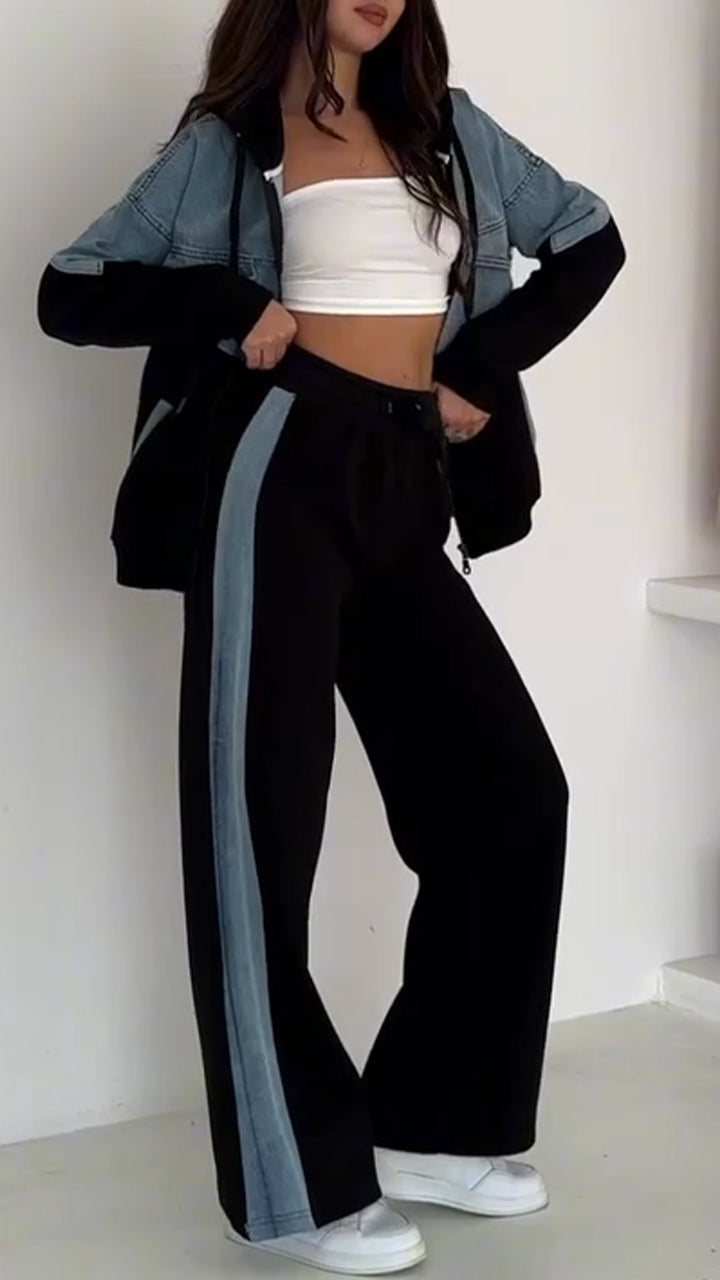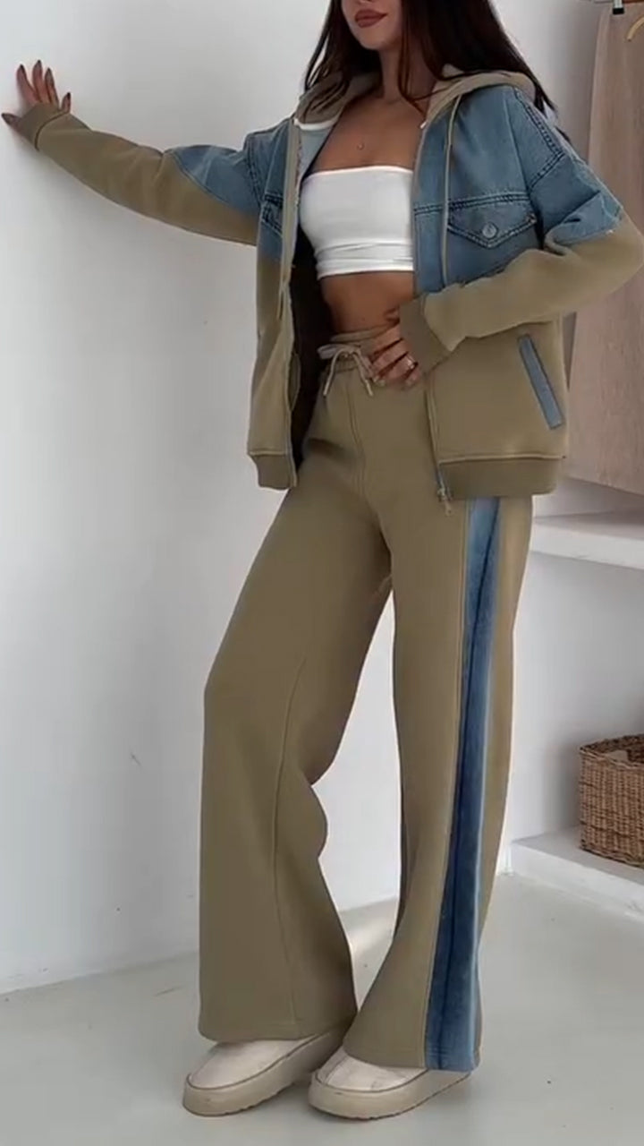 Women Hooded Drawstring Patchwork Denim Casual Suit