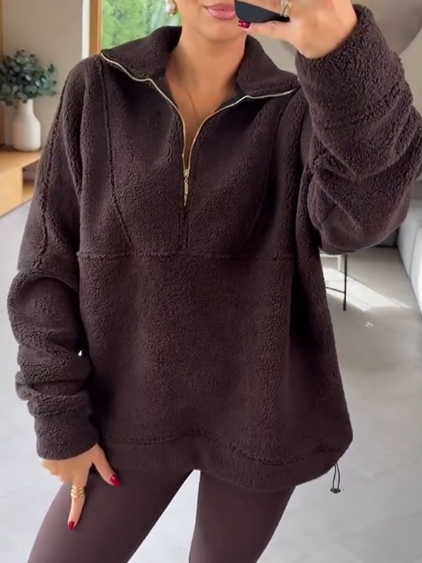 Women Lapel Half-zip Casual Plush Sweatshirt