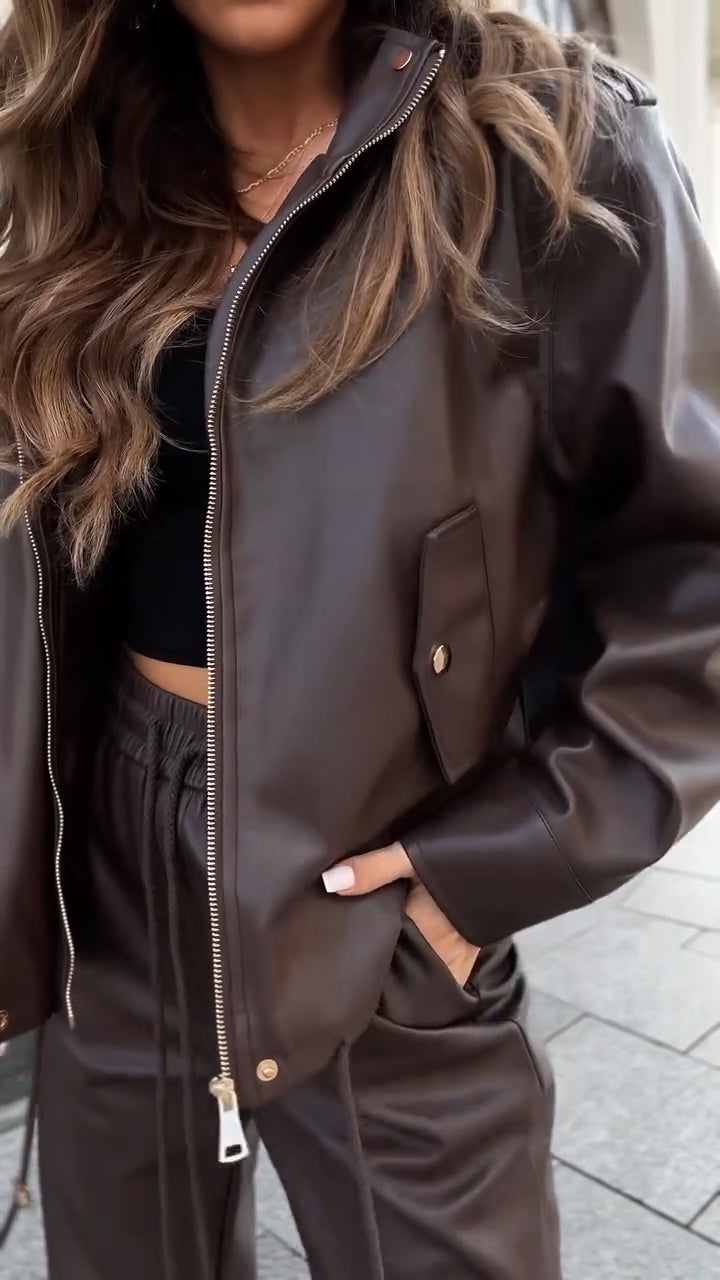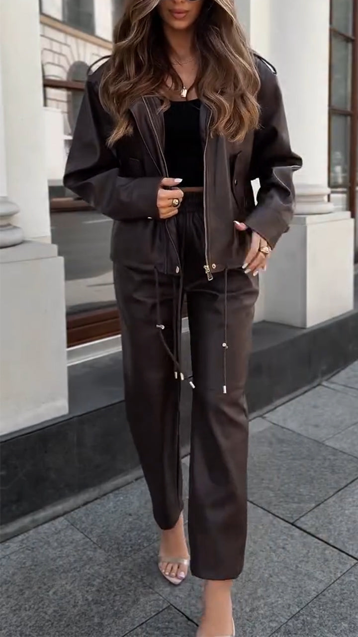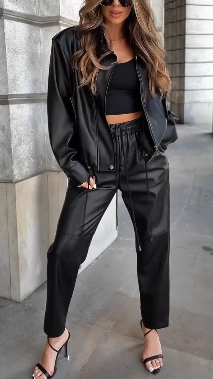 Women Lapel Leather Jacket + Pants Temperament Casual Suit