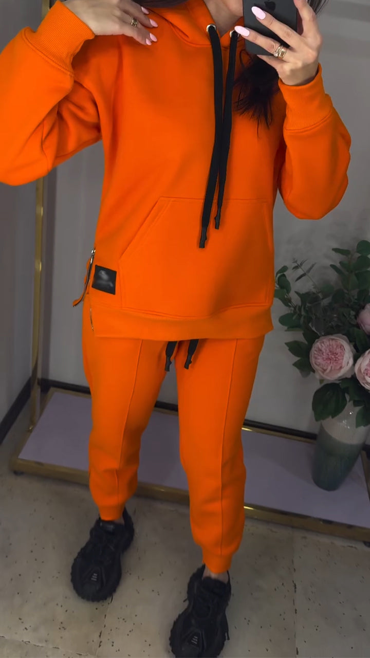 Women Round Neck Hooded Sweatshirt with Drawstring and Side Zipper + Casual Pants Set