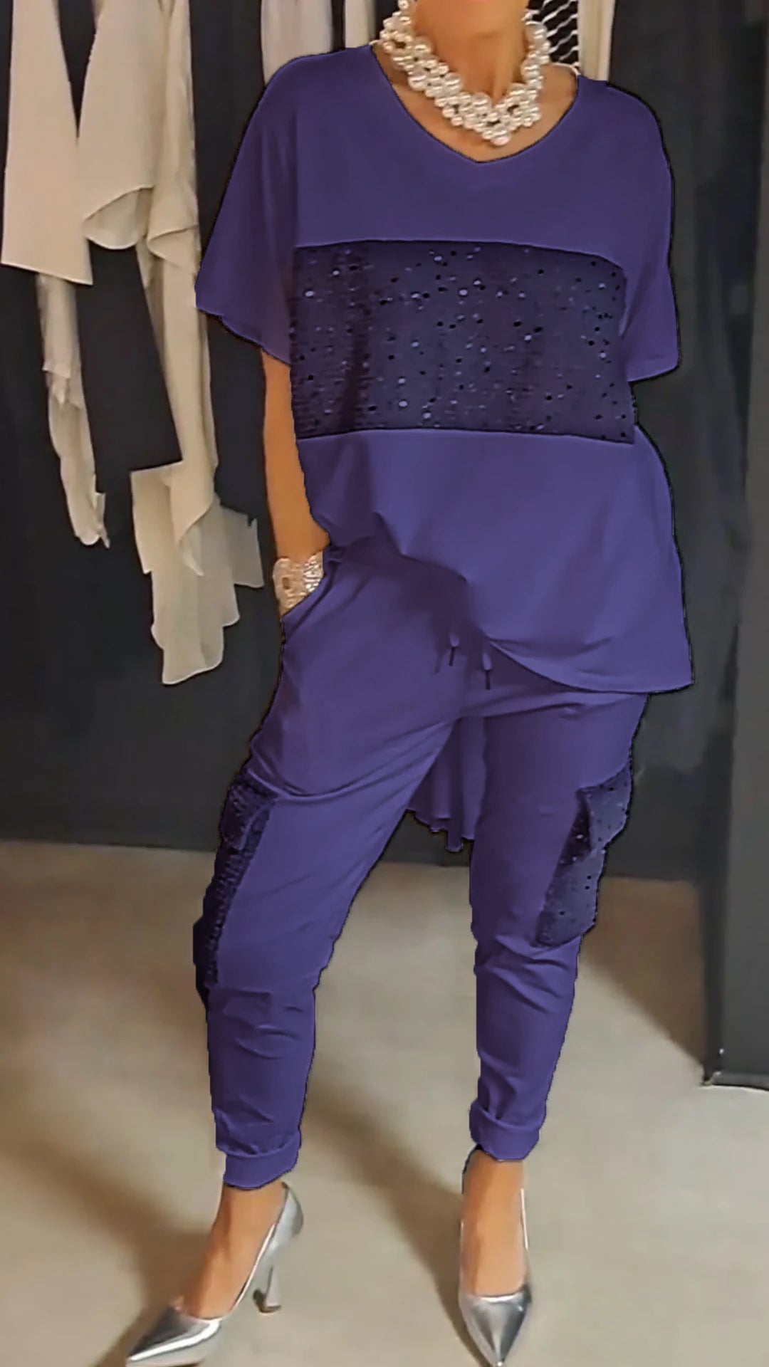 Casual Crew Neck Sequin Two-piece Suit