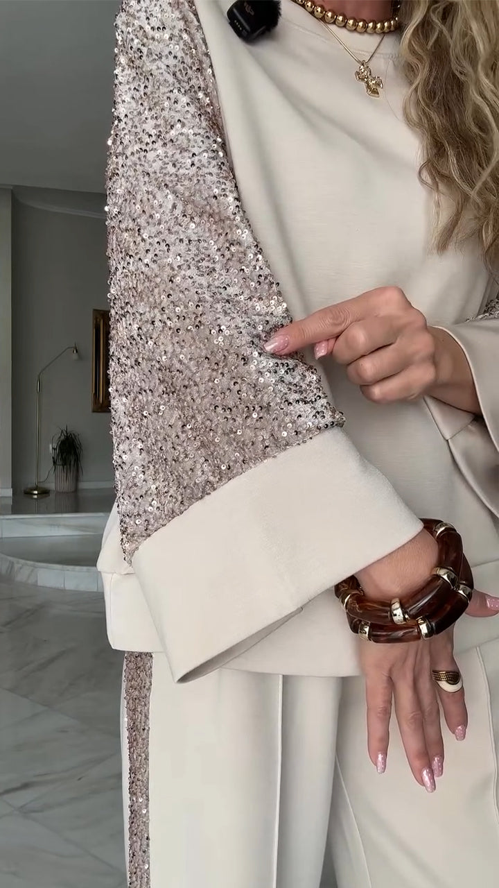 Ladies Round Neck Patchwork Sleeve Sequined Top+ Pants Casual Set