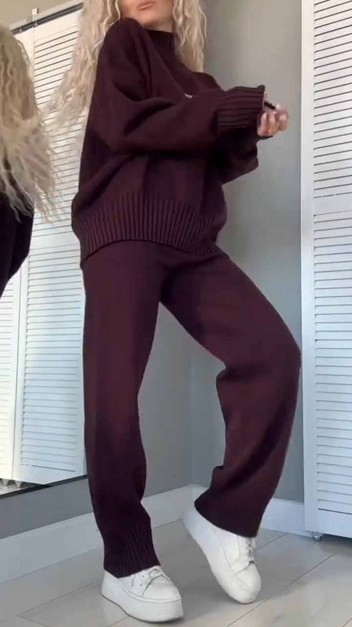Women High-neck Stitching Knitted Top + Pants Casual Suit
