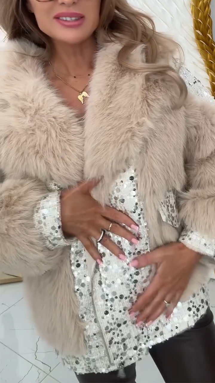 Womens Lapel Spliced Sequin Casual Plush Cotton Jacket
